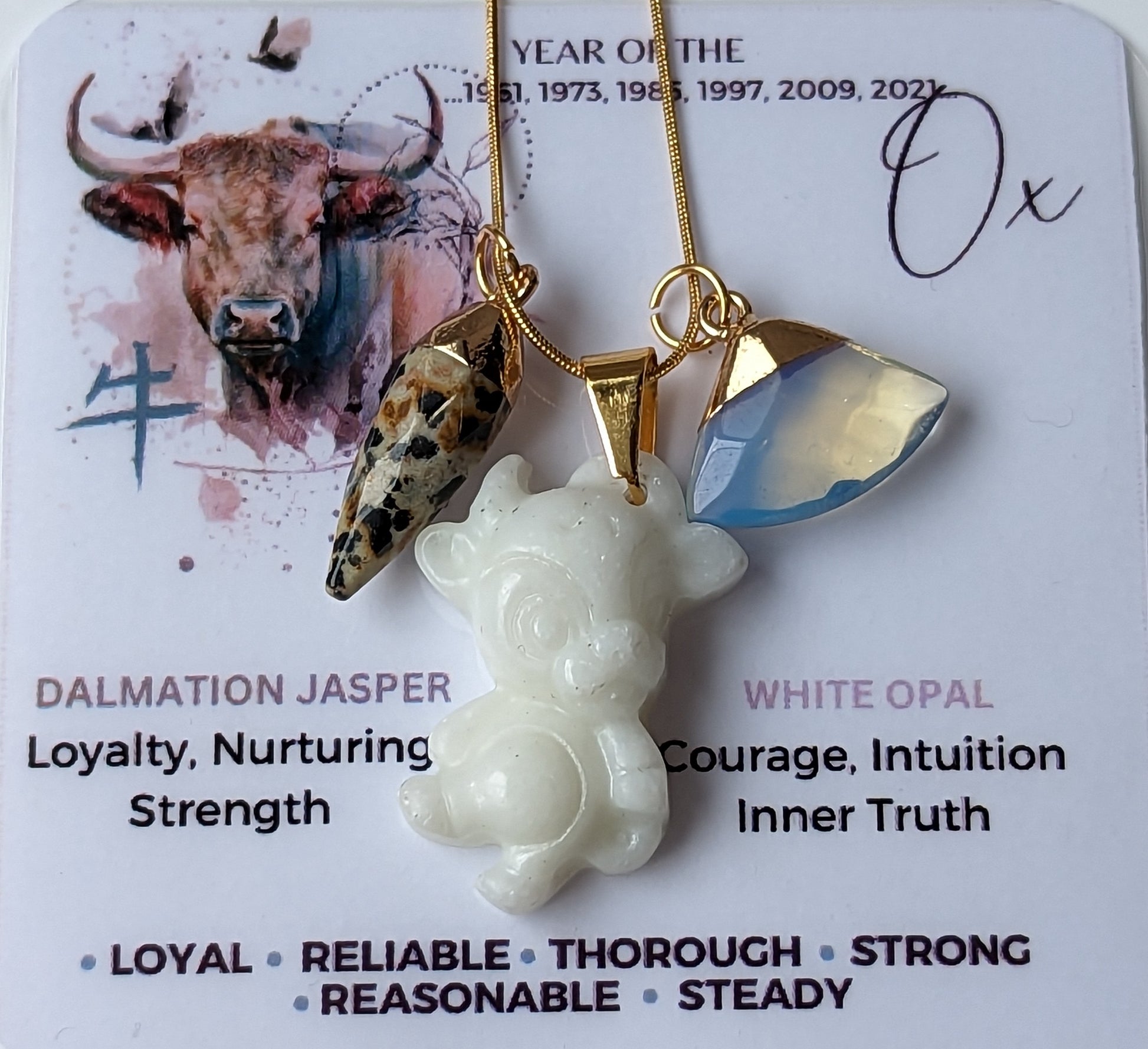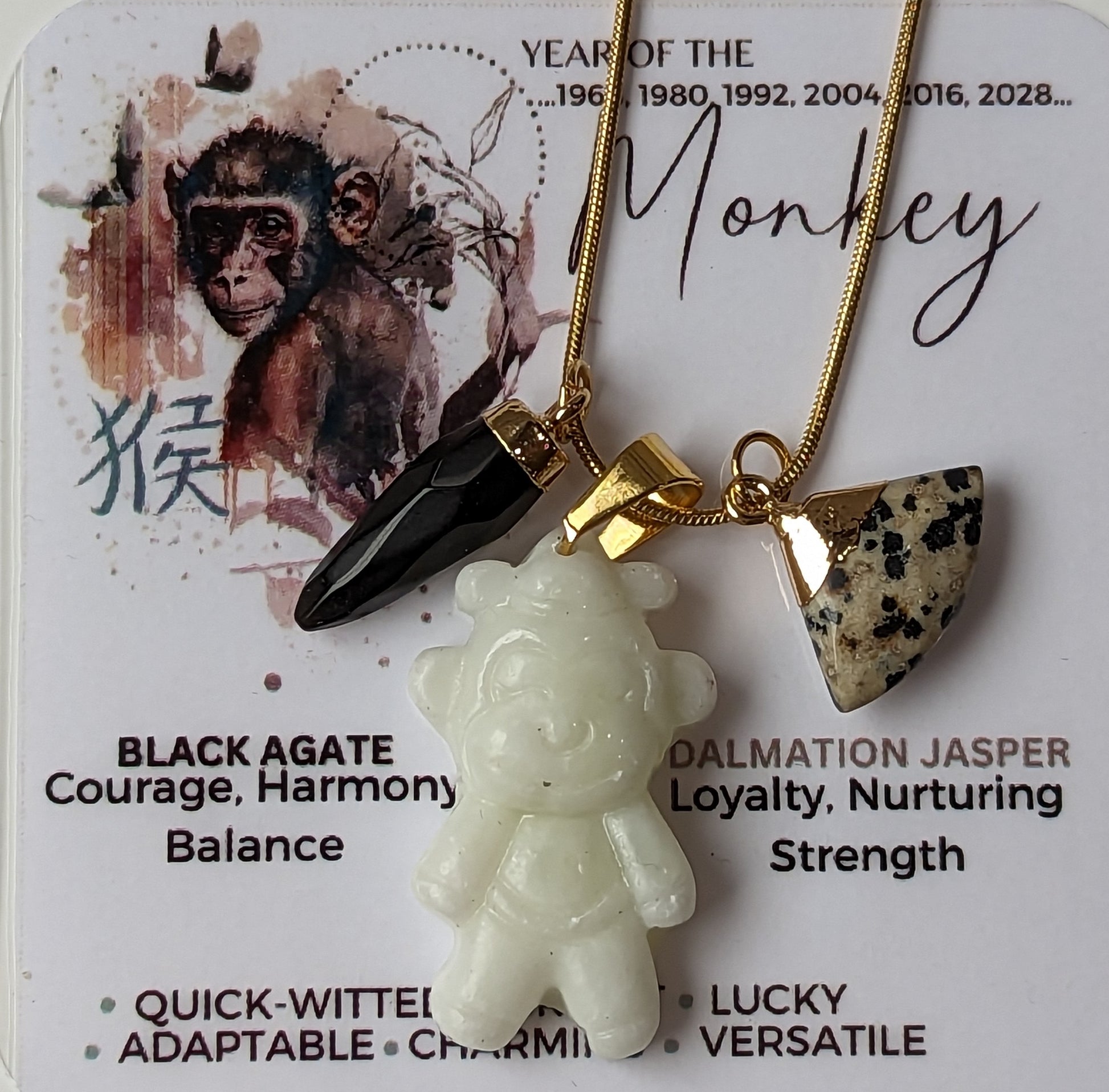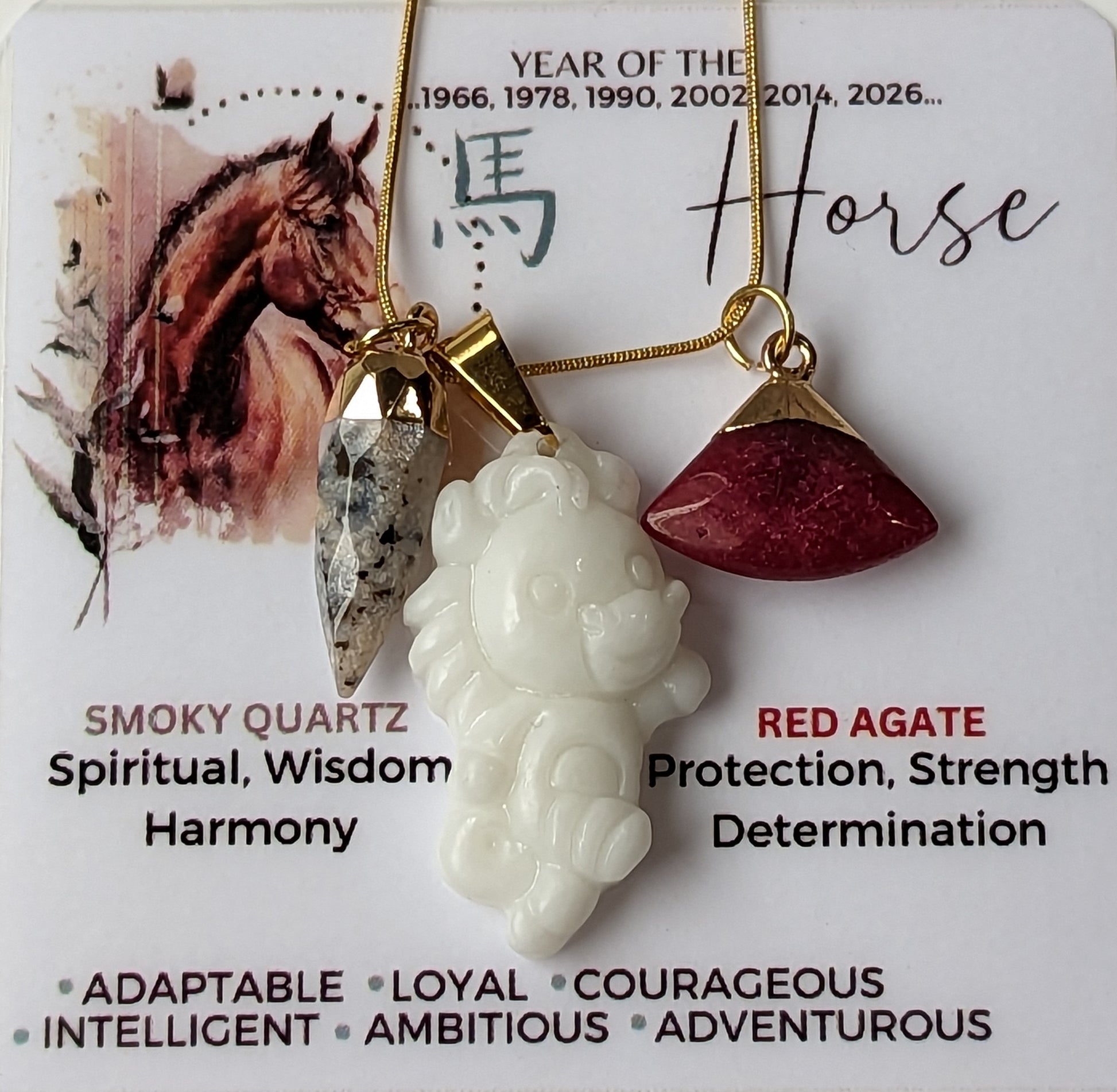 Discover your perfect match of power stones based on your zodiac spirit animal. There are twelve spirit animals: Rat, Ox, Tiger, Rabbit, Dragon, Snake, Horse, Goat, Monkey, Rooster, Dog, and Pig. We crafted a list of special stones that align with each zodiac animal, to connect with their nature and complement your energy. These alluring gemstones bring harmony and balance to your life, providing strong mental, physical, and spiritual benefits. Each zodiac animal is represented by a white jade stone, suspended in a sophisticated 18K stainless steel golden necklace, accompanied by its corresponding crystals and gems.